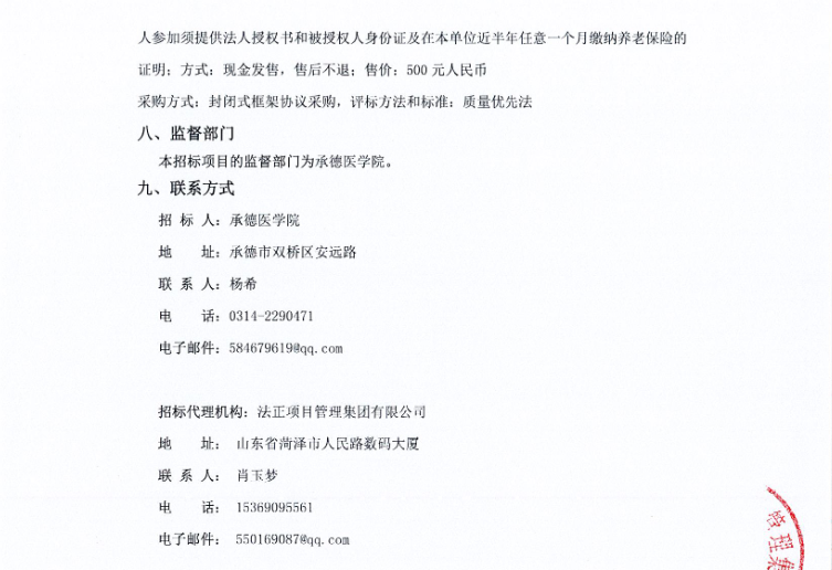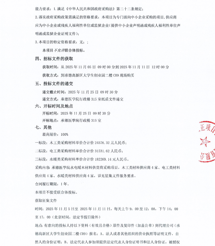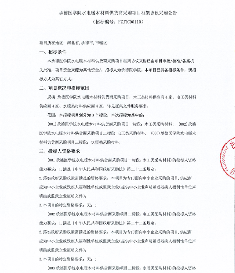 承德医学院水电暖木材料供货商采购项目框架协议采购公告