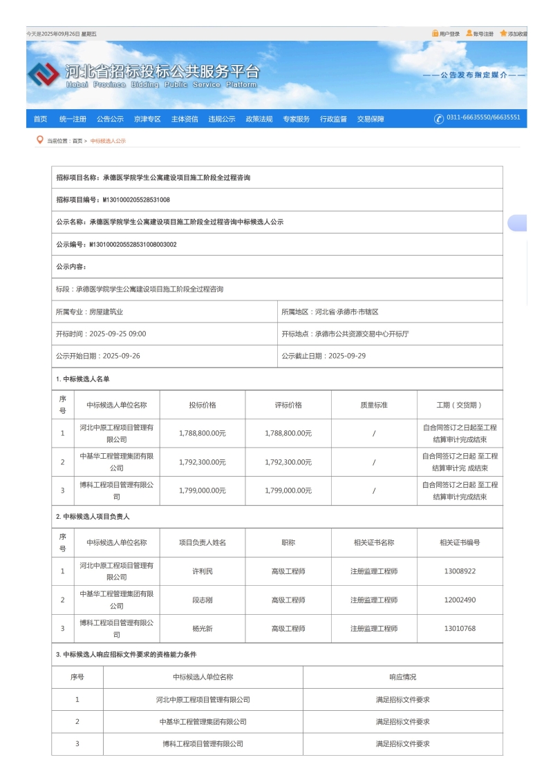 承德医学院学生公寓建设项目施工阶段全过程咨询中标候选人公示