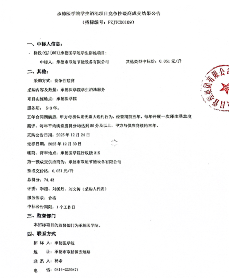承德医学院学生浴池项目竞争性磋商成交结果公告